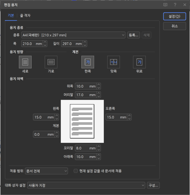 - **여백**: 위·아래·왼쪽·오른쪽·머리말·꼬리말 영역