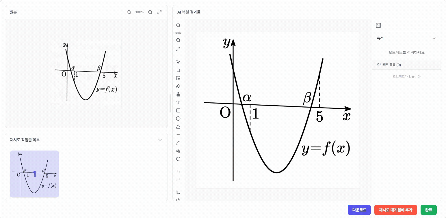 비스듬하게 촬영되거나 스캔된 이미지를 수평·수직에 맞게 바로 세울 수 있습니다. **그래프나 도형**이 포함된 이미지가 기울어져 입력되었을 때 유용하게 사용할 수 있습니다.
