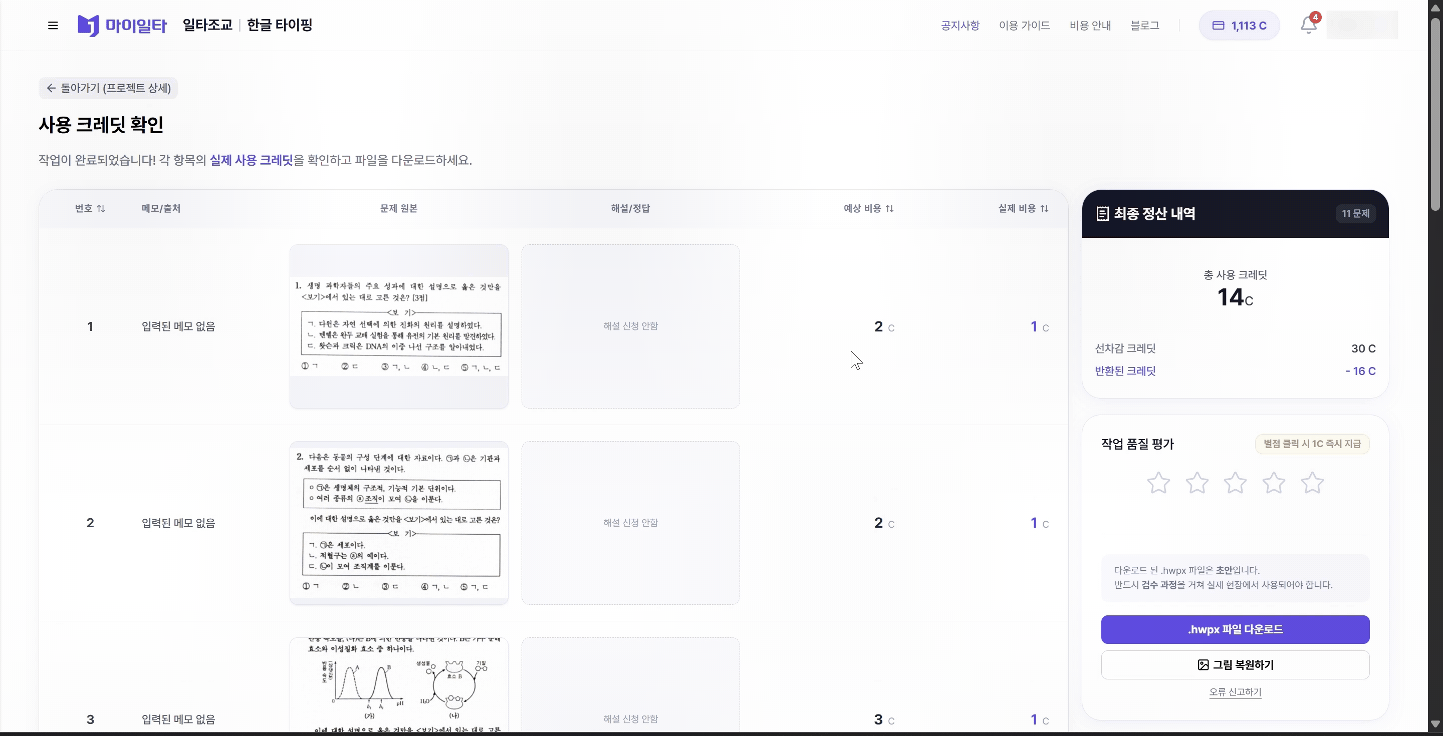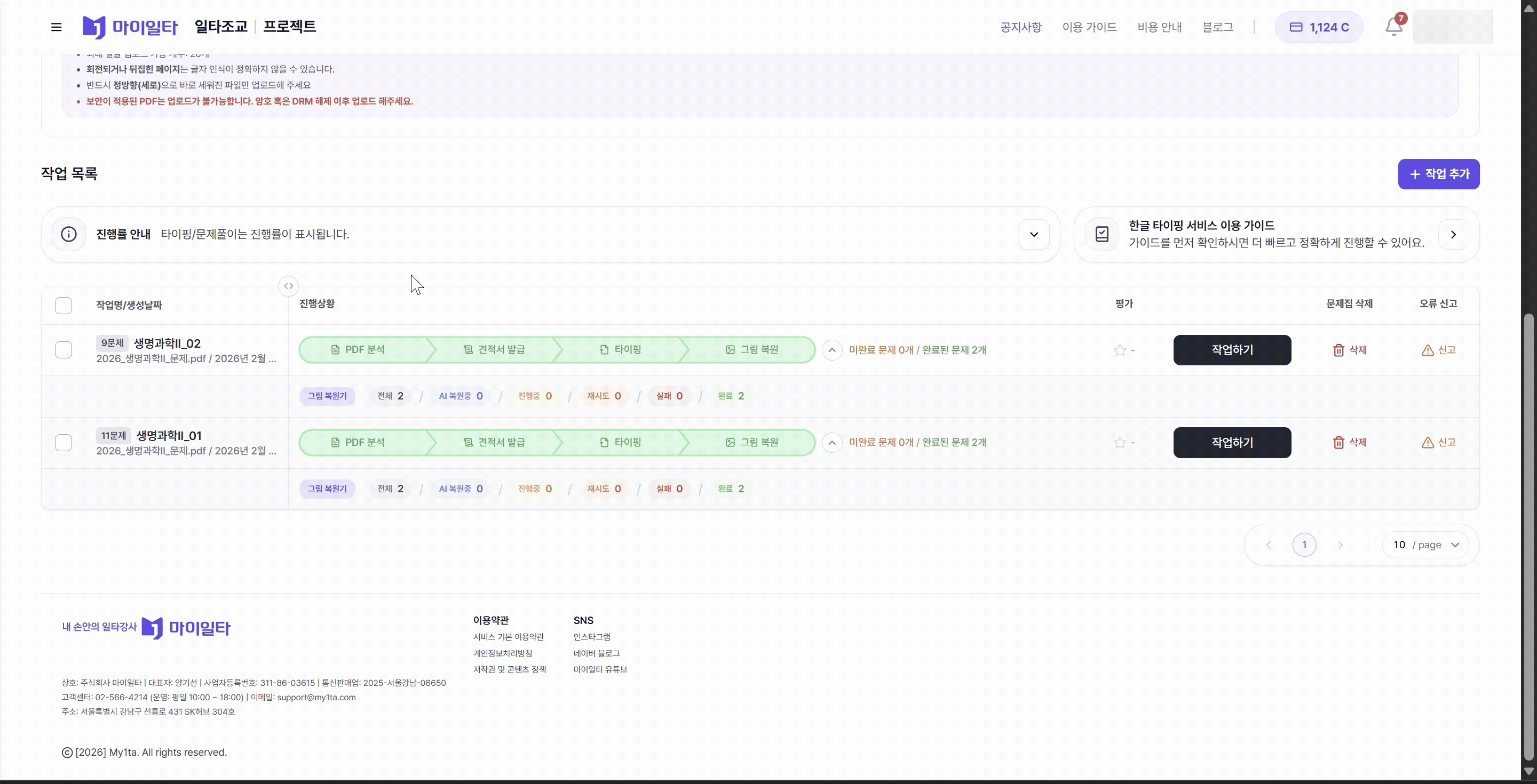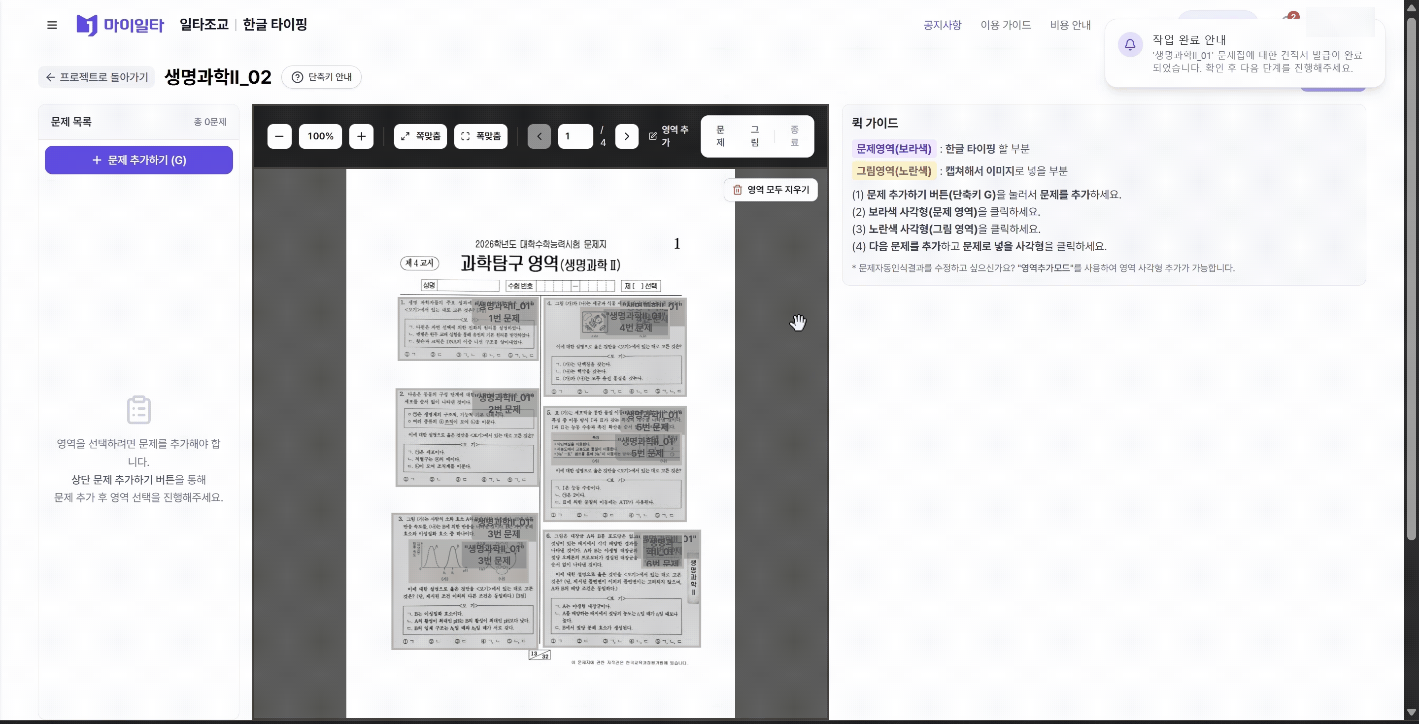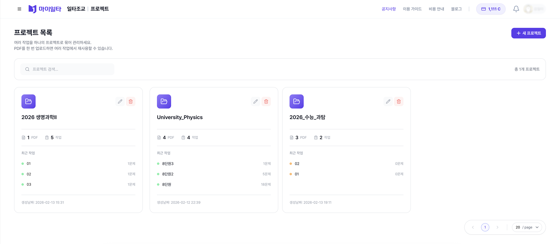 마이일타 v1.4 업데이트: 프로젝트 기능 출시. 여러 PDF 통합 관리, 타이핑→그림복원 한 화면 완결, 일괄 HWPX 다운로드로 작업 시간 절반 단축.