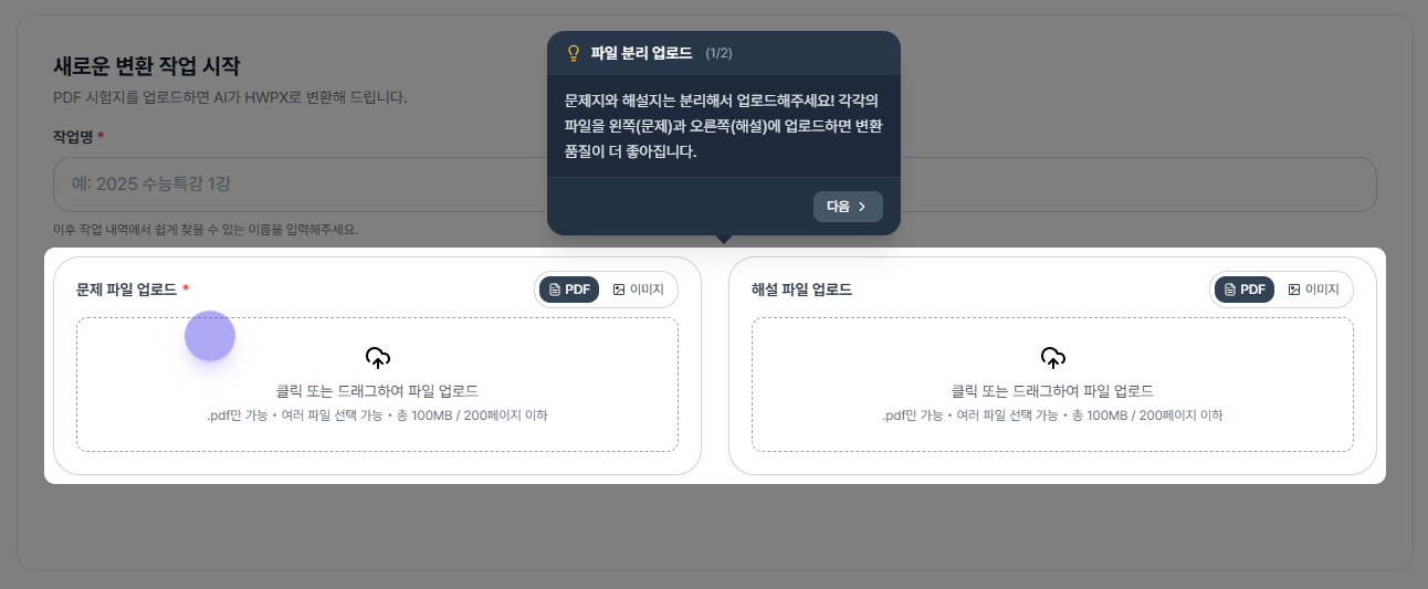 - PDF 업로드 전, "문제"와 "해설" 페이지만 남기고 나머지는 미리 삭제해 주시면 정확도가 크게 높아집니다. 불필요한 페이지가 많을수록 오작동 확률이 올라갑니다.