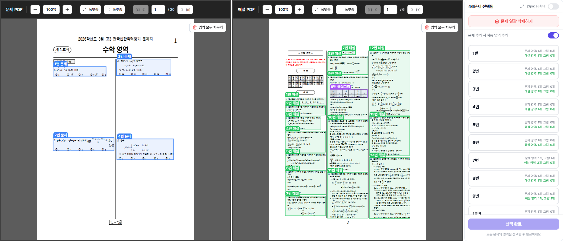 기존에는 PDF 영역을 지정할 때 문제 선택을 완료해야 해설 선택 화면으로 넘어갔습니다. v2.0부터는 문제와 해설을 한 화면에서 동시에 보면서 선택할 수 있습니다.